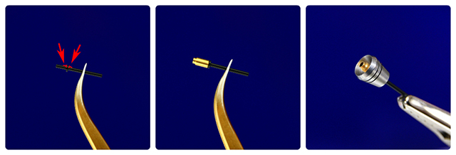 補足:ノズル中央の出っ張りを押さえたいときは、ロングアポジ2-4mm(左)を別売りのアポジ2mm(右)に変更してください。