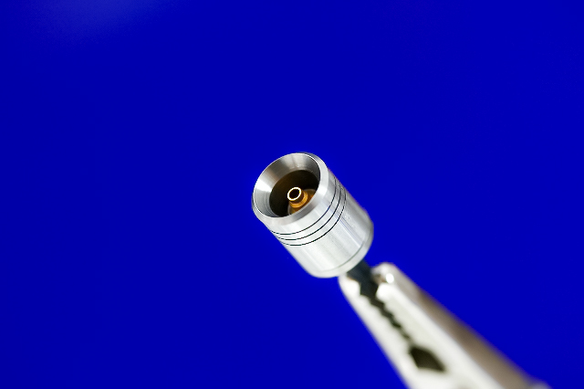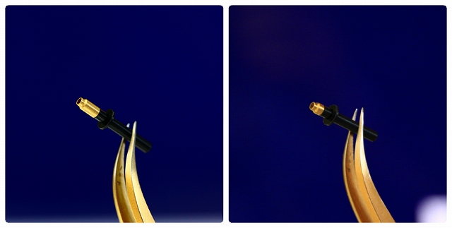 補足:ノズル中央の出っ張りを押さえたいときは、ロングアポジ2-4mm(左)を別売りのゴールドアポジ2mm(右)に変更してください。